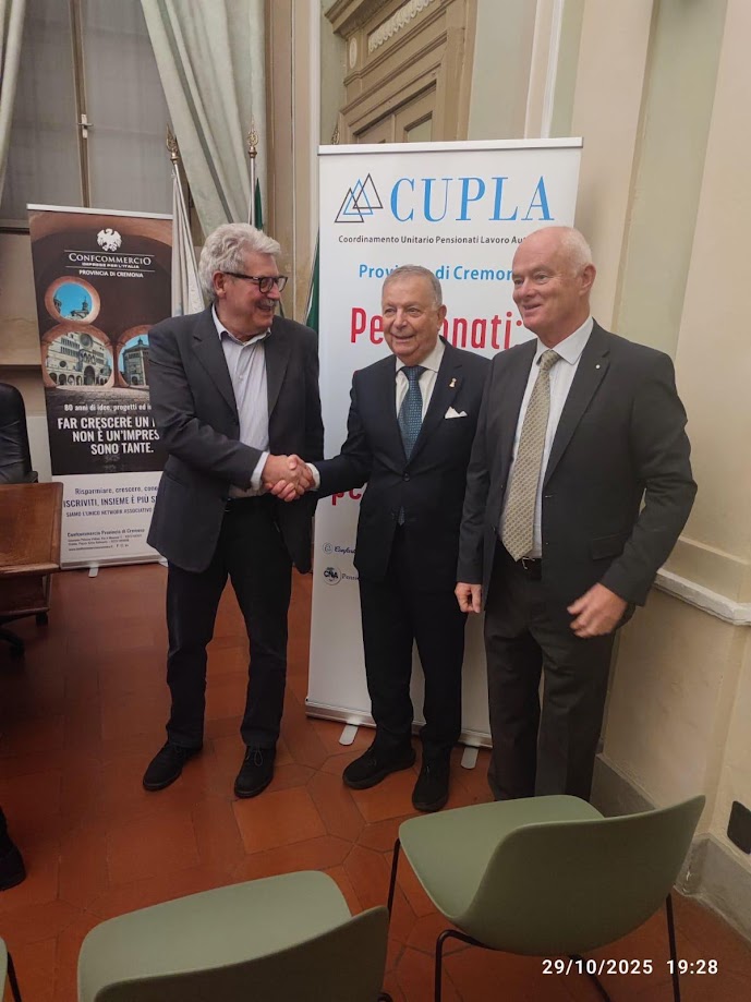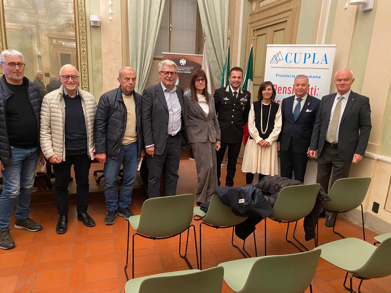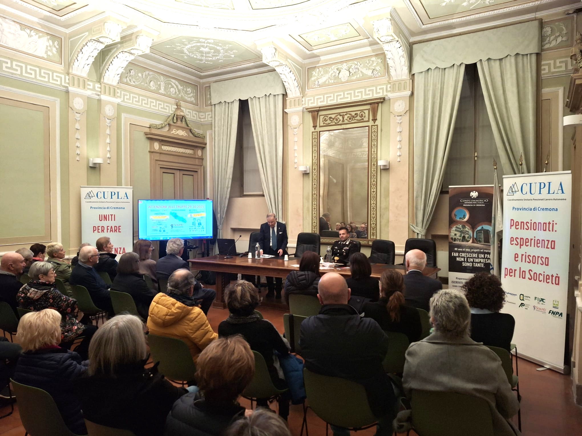 Mercoledì 29 ottobre, alle ore 18.00, presso la Sala Guerrini di Confcommercio Cremona, si è svolta la prima iniziativa organizzata dal Cupla-Coordinamento Unitario Pensionati Lavoro Autonomo di Cremona, rivolta alla tutela delle persone anziane contro le truffe. L’evento – dal titolo “Truffe agli anziani, informarsi per non subirle” – ha puntato a sensibilizzare i partecipanti e a fornire strumenti concreti per riconoscere e prevenire raggiri, con particolare attenzione ai comportamenti da adottare nella vita quotidiana. In sala erano presenti i rappresentanti delle associazioni aderenti al Cupla. Il Coordinatore Provinciale Fausto Casarin, il coordinatore regionale Romeo Andreini, l’Assessora alle Politiche Sociali e Fragilità Marina Della Giovanna, e il Viceprefetto Vicario della Prefettura di Cremona, Iole Galasso.