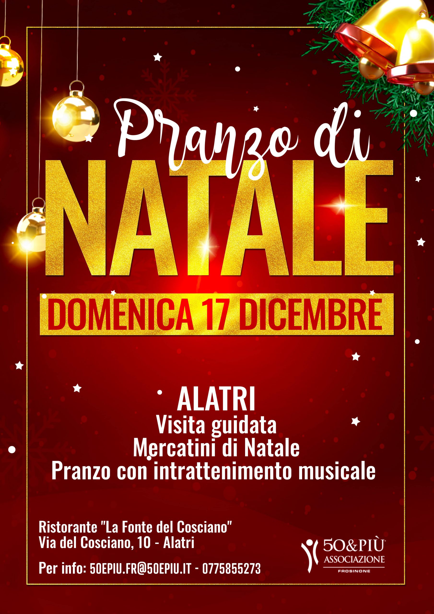 In occasione delle prossime festività natalizie 50&Più Frosinone organizza per i soci il consueto e tradizionale Pranzo di Natale per domenica 17 dicembre ad Alatri.