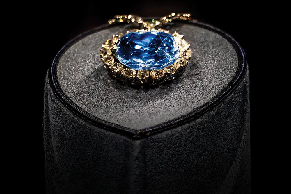 Tutto inizia nel XVII secolo, quando il mercante francese Jean-Baptiste Tavernier torna da una delle sue spedizioni in India con un diamante grezzo da 112 carati, probabilmente estratto dalla miniera di Kollur a Golconda. Nel 1668 lo vende a Luigi XIV insieme ad altre pietre preziose e il gioielliere di corte, Sieur Pitau, nel 1673 lo trasforma in un brillante da 67 carati, di un intenso blu acciaio: nasce così il Diamante Blu della Corona di Francia, noto come “Francia Blu”. Sospeso a un nastro di seta, brilla come una stella sul petto del Re Sole nelle cerimonie più importanti. Ma è con i suoi discendenti che iniziano i guai.